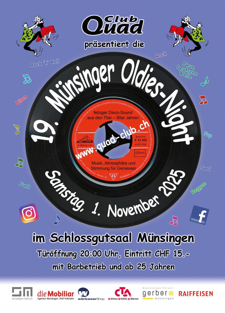 Die besten Hits aus den 70er–90er Jahren, abgespielt ab CD’s und Vinyl-Schallplatten, sorgen jeweils an den Partys für erstklassigen, fätzigen Sound mit einem Mix aus Rock, Pop, Disco, Schlager, Rock ’n‘ Roll, Blues, Reggae und Neue Deutsche Welle. Einmalige Stimmung ist garantiert!